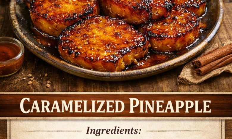 Caramelized Pineapple is a simple yet luxurious dessert that highlights the natural sweetness and tropical flavor of fresh pineapple. When pineapple slices are gently cooked with butter, brown sugar, and honey, they develop a rich caramel coating that enhances their juicy texture and bright flavor. The combination of warm spices and sweet caramel creates a dessert that is both comforting and elegant.