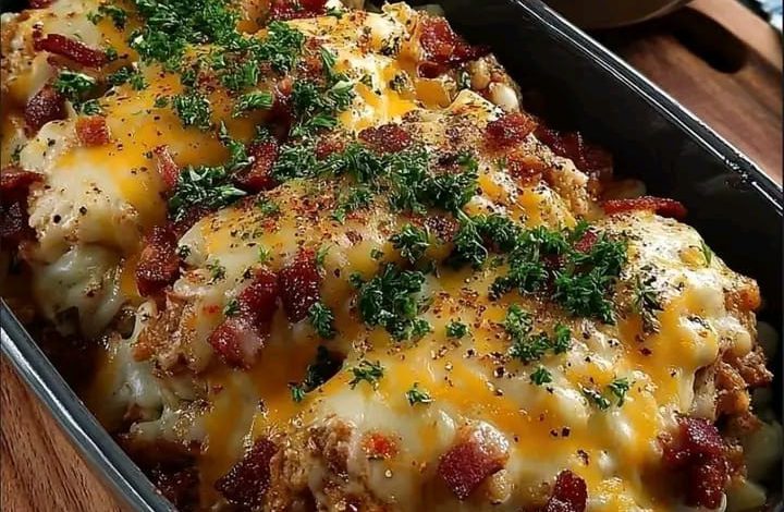 The golden melted cheese on top creates a rich, bubbling layer that seals in all the delicious flavors beneath. Crispy bacon adds texture and smokiness, while the creamy sauce keeps the chicken juicy and tender. Paired with mashed potatoes or roasted vegetables, this dish becomes a complete and deeply comforting meal.