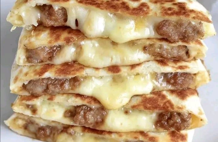 Place one tortilla on a flat surface. Sprinkle a generous layer of mozzarella and cheddar cheese over half of the tortilla. Add a layer of the cooked beef mixture evenly on top of the cheese. Sprinkle a little more cheese over the beef for extra meltiness.