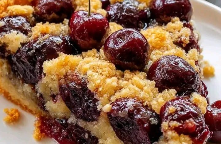 Another beautiful feature of this recipe is its attractive appearance. The deep red color of the cherries against the pale cake and golden crumbs makes the dessert look vibrant and festive. It can be served on ordinary days as a comforting homemade sweet, but it is also elegant enough for celebrations and special occasions. The image shows a slice filled generously with cherries and topped with crumbly golden pieces, suggesting a rich, moist, and flavorful dessert that is both rustic and refined.