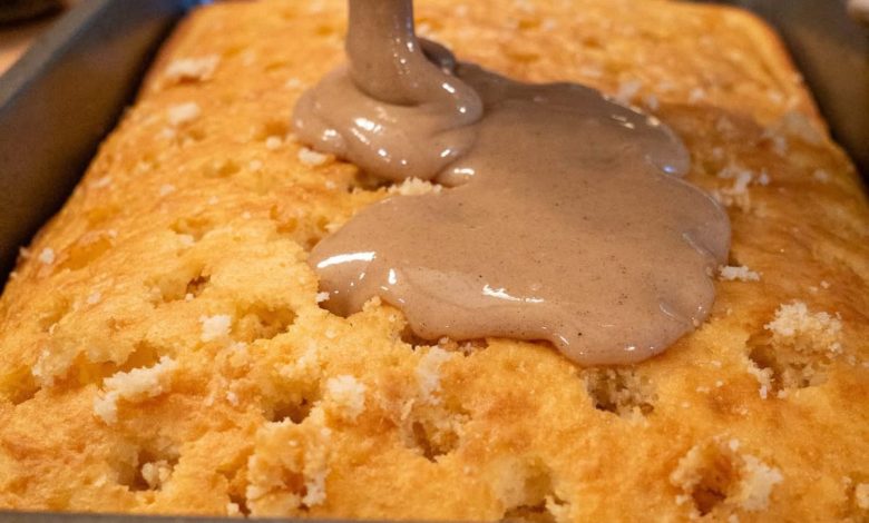 Using the handle of a wooden spoon or a skewer, poke small holes all over the warm cake. Pour the cinnamon butter glaze evenly over the top, allowing it to seep into the holes. The glaze will soak through, adding incredible flavor and moisture to every bite.