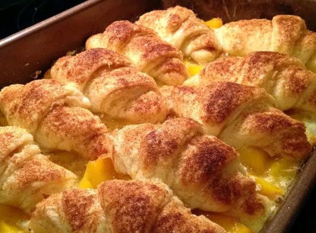 Few desserts are as comforting as a fruit cobbler fresh from the oven. This version uses juicy peaches layered beneath soft crescent rolls that puff up beautifully as they bake. The cinnamon-sugar topping adds warmth and sweetness, while the buttery dough absorbs the peach juices, creating a tender, almost cake-like texture. Whether served on its own or with a scoop of vanilla ice cream, this dessert always feels special and satisfying.