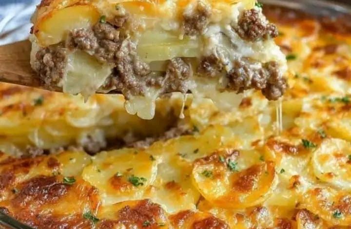 Few dishes capture the warmth and comfort of home-cooked meals like a rich, golden Potato and Ground Beef Casserole. With layers of thinly sliced potatoes, seasoned ground beef, and creamy cheese sauce, this dish is the very definition of cozy comfort food. Every bite brings together tender potatoes, juicy meat, and melted cheese — all baked to perfection with a bubbling, crispy top.