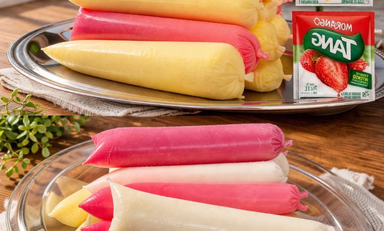 This dessert is more than just ordinary frozen juice. Creamy Tang Ice Pops are a homemade frozen treat that combines fruit flavor, creamy richness, and a soft icy texture in one simple recipe. What makes them especially attractive is the variety of colors and flavors that can be prepared at the same time. The pink ice pops may be made with strawberry flavor, the yellow ones with passion fruit flavor, and the white ones with a creamy milk-based mixture. When arranged on a plate, they create a bright and festive appearance that immediately draws attention. These ice pops are often associated with summer, relaxation, and joyful family moments because they are cold, sweet, and refreshing. They are also convenient because they can be prepared in advance and stored in the freezer until needed. Another lovely feature of this recipe is its flexibility. Different flavors can be used, and the sweetness can be adjusted according to personal preference. Because of this, Creamy Tang Ice Pops are not only easy to make, but also customizable and enjoyable for many occasions.