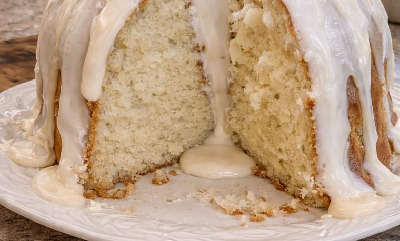 This cake stands out with its stunning appearance. It is usually baked in a round or bundt shape, then generously covered with a thick vanilla glaze that slowly drips down the sides. The glaze creates a glossy, smooth coating that contrasts beautifully with the soft cake underneath. On top, a sprinkle of shredded coconut adds texture and visual appeal. When sliced, the inside reveals a tender, airy crumb that looks as good as it tastes. It is best served on a white plate to highlight its creamy color, making it perfect for special occasions or elegant dessert tables.