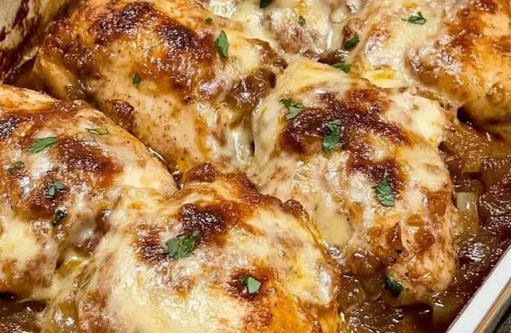 French Onion Chicken Bake is a comforting, rich, and deeply flavorful dish that transforms simple chicken breasts into a gourmet-style dinner. Inspired by the classic French onion soup, this recipe layers caramelized onions, savory broth, melted cheese, and tender baked chicken into one irresistible meal. Every bite is loaded with sweet onion flavor, gooey cheese, and perfectly seasoned chicken—creating a dish that feels both rustic and elegant. Whether you’re preparing a cozy weeknight meal or serving guests, this French Onion Chicken brings warmth, aroma, and restaurant-quality taste straight to the table.