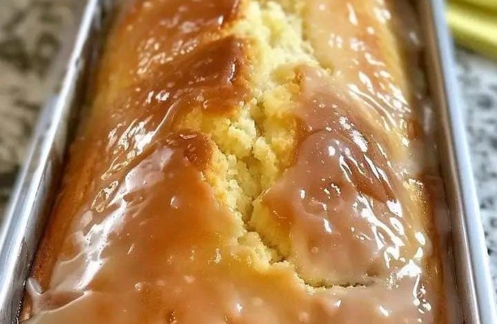 The loaf cake is baked to golden perfection, with a moist crumb and a lovely crack down the center that showcases its rustic charm. Once cooled, a smooth lemon glaze is drizzled generously over the top, creating a glossy finish that drips down the sides. The contrast of the golden cake and the shiny glaze makes it both elegant and comforting, a centerpiece-worthy bake that looks as good as it tastes.