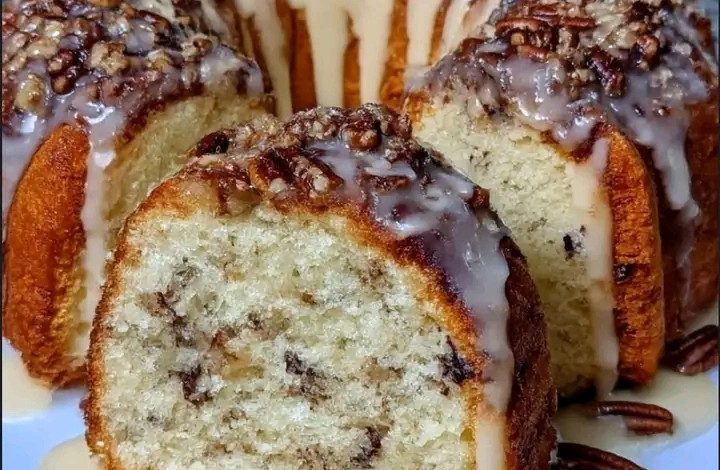 When sliced, the cake reveals a soft and delicate interior with small pieces of pecans distributed throughout the crumb. This creates a beautiful visual texture and promises a satisfying bite. The contrast between the pale interior, the golden crust, and the creamy glaze gives the cake a balanced and attractive look. Served on a cake stand or large plate, it becomes an eye-catching dessert for a coffee table, dessert buffet, or holiday spread. It pairs especially well with coffee, tea, or warm milk, and it can also be served with a spoonful of whipped cream or an extra drizzle of glaze for a more indulgent experience.