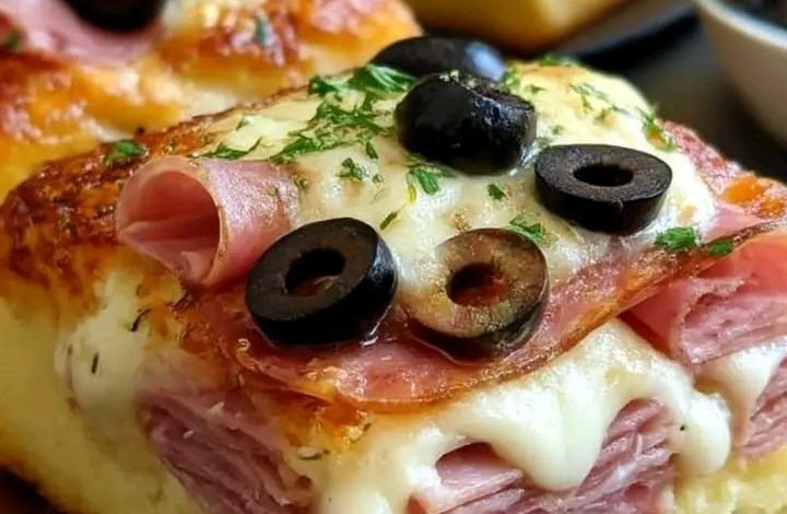 This dish is also highly adaptable. You can prepare it using homemade dough or ready-made bread dough. The toppings can be adjusted according to personal taste, so you may add salami, turkey, sweet corn, peppers, mushrooms, or different cheeses. However, the combination shown in the image—ham, cheese, olives, and herbs—already creates a classic and satisfying flavor that many people enjoy. With its golden appearance and rich topping, this recipe is both comforting and impressive.