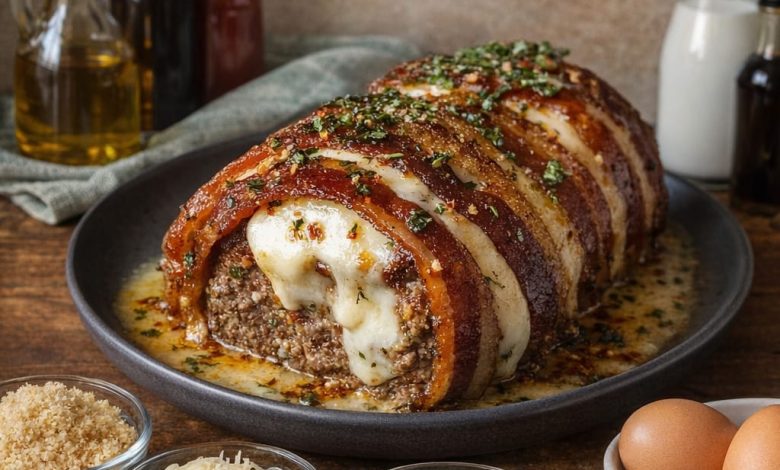 Mozzarella Stuffed Bacon Wrapped Meatloaf is a rich, comforting, and flavorful main dish that transforms a traditional meatloaf into something far more special and impressive. It combines seasoned ground meat, creamy melted mozzarella cheese, and crispy smoky bacon in one delicious recipe. This dish is perfect for family dinners, weekend meals, special gatherings, or whenever you want to prepare something hearty and satisfying. The golden bacon on the outside adds a beautiful presentation, while the melted mozzarella in the center creates a soft and cheesy surprise in every slice.