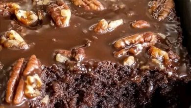 - Arrange the sliced bananas, whole walnuts, and pecans on top of the cake while the glaze is still wet so they stick.
