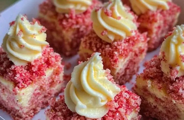 Red Velvet has long been considered one of the most elegant and classic cake flavors. Its combination of soft, velvety sponge with a hint of cocoa and vibrant red color makes it visually stunning and irresistibly delicious. In this recipe, we transform the traditional Red Velvet Cake into delightful bite-sized cubes, coated with colorful crumbs and topped with silky vanilla cream swirls. These small portions are perfect for parties, tea time, or gifting, offering both beauty and taste in every bite.