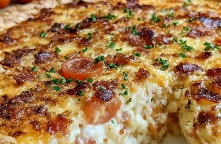 This type of pie is loved in many homes because it feels both simple and elegant. It can be prepared with everyday ingredients that are often already available in the kitchen, yet the final result looks attractive enough to serve to guests. The image shows a beautifully baked pie with a golden top, small tomato pieces, herbs, and a soft interior. This suggests a filling that is rich, tender, and comforting, with cheese melted throughout and a lovely browned surface that makes the dish even more appetizing.