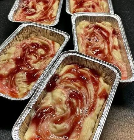 Spoon a layer of bread batter into each prepared pan. Add a layer of the cheesecake mixture on top, followed by small spoonfuls of strawberry jam or sauce. Use a toothpick or knife to gently swirl the strawberry sauce into the cheesecake layer. Repeat the layers until the pans are filled, finishing with a strawberry swirl on top. -