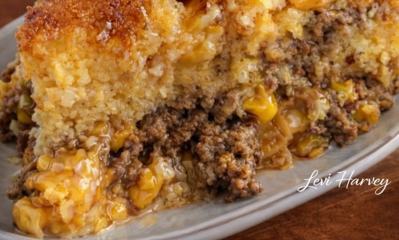 Served straight from the baking dish, this casserole is layered and rustic, with a thick, moist cornbread top that turns golden brown in the oven. Beneath the cornbread lies a savory beef and corn mixture, rich with seasoning and melted cheese that creates a creamy, slightly gooey texture. When sliced, the layers hold together beautifully, showing off the contrast between the fluffy cornbread and the juicy, flavorful filling. Every bite is warm, comforting, and packed with flavor.